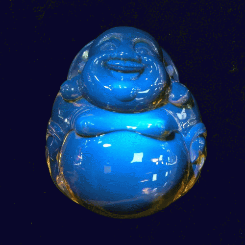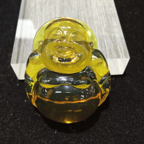 缅甸琥珀 柳青泛茶色,阳光下高蓝正装弥勒佛 老坑料子,净水无杂无裂,克重:34.1g 尺寸:45.7*54*25.3mm