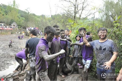 参赛选手在田地里满脸被抹稀泥。