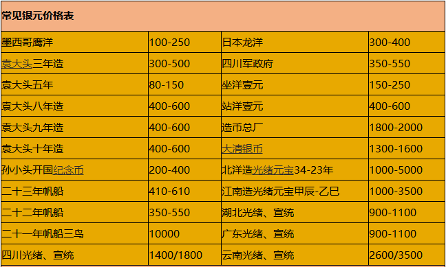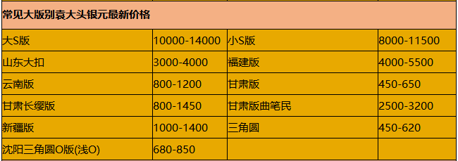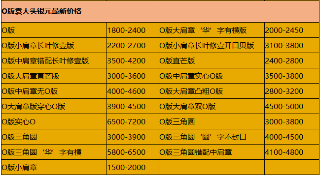 第一白银网4月12日讯 过去,谈到收藏钱币很多人只知道收藏纸币、硬分币以及央行发行的普通纪念币。近年来,随着人们收入的提升,加上投资渠道的多元化,具有贵金属性质以及国家法定货币性质的金银币正成为越来越多家庭资产配置的新渠道。 对于一些已经深谙收藏之道的投资者来说,进行银币收藏前,势必要对银元的价格进行简单的了解,分析其收藏价值和未来的潜力。银元收藏价格表就几乎成为了一般投资者最为关注,一旦从价格表中发现升值空间巨大的,投资者就会积极入手,行情不乐观时也能即使抛售。 下面是小编整理的最新银元收藏价格表,希望对投资者和收藏爱好者有所帮助。 常见银元价格表 袁大头银元价格 O版袁大头银元价格 需要注意的是,银元收藏表是依旧全品相的价格来进行汇总的,如果达不到全品相的要求,其价格可能相对较低。具体成交价格与银元的实际品相、买家卖家以及当时的行情有一定的关系。