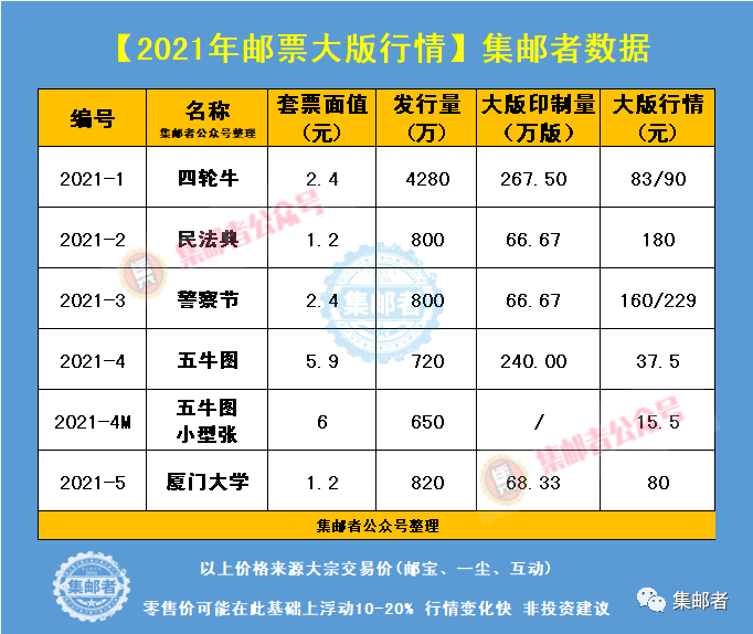集邮者讯(JYZhe.com),目前2021年已发行的新邮套票行情都有一定溢价,看看最新的大版数据及大版行情: 一般来讲,大版价格波动较大,除刚需外,不建议追高,随着时间推移,年底左右会有一定回落,大版票供需平衡后,过度溢价的新邮大版,有一定的下调空间。但随着发行量的缩减后,新邮大版很少出现打折的大版了。 就像2020年全年大版最高起溢价幅度近2倍+,现在下调后目前仍有53%的涨幅!因此大版资格的稀缺度仍在!