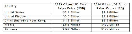 来源:99艺术网国际频道 作者:姜小明编译 Artnet公布了2015年全球艺术市场数据。全球销售数字下降6%。中国市场成交额下降30%。美国上扬19%。纽约是销售的集中地,在整个市场下滑的局面下做到了逆市而行。 2015年上半年的艺术拍卖结果被第二季度业绩大大影响。以2015年6月30日为截至,市场价值较2014年同期收缩了6%。送拍的拍品数量减少了17%。总体来说,半年以来,共141,200件作品被销售,总价值为81亿美金(2014年为86亿美金)。 此次下降主要体现在艺术市场5大国中4家的不足表现:它们是英国、中国、法国和德国。特别是中国,总成交额下降了30%,严重影响了国际拍卖市场趋势。美国却逆势增长(19%),特别是第二季度增长(21%)。美国以34亿成交额荣登榜首,占据全球市场中42%的份额。其次为英国和中国(包括香港)。 这意味着什么呢?艺术市场在收缩,特别是在经济放缓地区,这并不意外。但是美国和英国所体现出的现金与高价值资产间的全球博弈,外加美国经济增长的趋势,却令我们直观感到艺术市场破竹之势的到来。