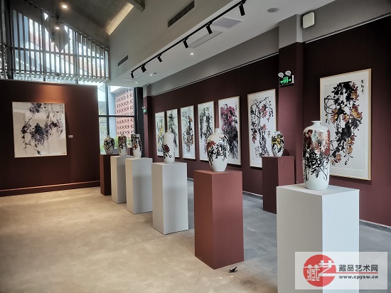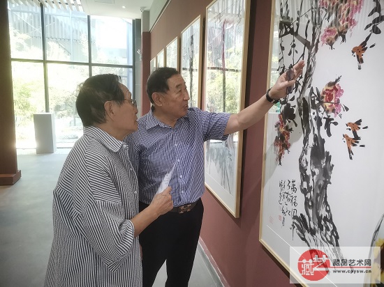 原总装备部常规武器装备试验鉴定中心和装备学院总工程师、教授,将士丰采书画院副院长程永生(右)与藏品艺术网收藏艺委会副主任兼秘书长,将士丰采书画院古玩专家鉴定组专家张惟林(左)在展出作品前驻足观看