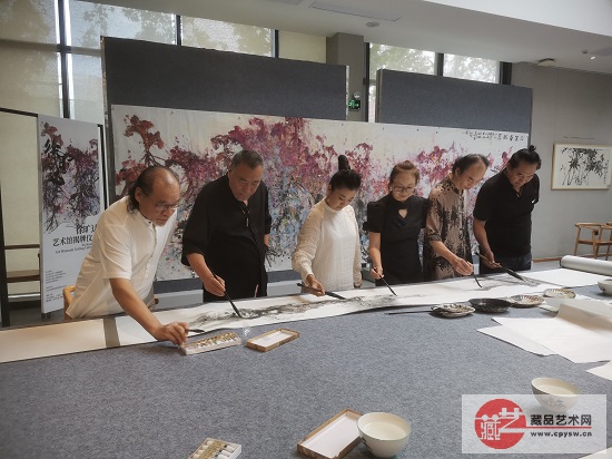 9月17日下午,徐旷达(左2)与艺术家余锋(左1)、牛玲玲(左3)、张静(右3)、张绍全(右2)、都耀明(右1)等在南王岗乡村会客厅一起艺术交流,共绘书画长卷。