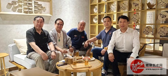 活动间隙,艺术家程永生(左1)、张惟林(左2)、高金福(左3)和王景轩(右2)与中央电视台主持人逗号(右1)一起茶叙