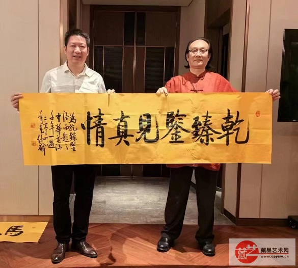 任麟(右)与王记生(左)在其书写的“乾臻鉴 见真情”作品前留影