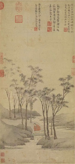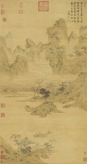 ②《万壑争流图》以“高远法”构图制造心理压迫感,又在溪瀑处打开气眼,体现儒家“中和之美”的审美理想。
