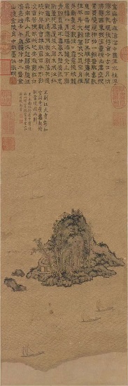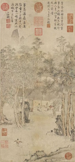 ②诗书画融合:作品题跋占比常达画面1/3,《绿荫草堂图》中23行题记与山水构成“可读可游”的立体空间。