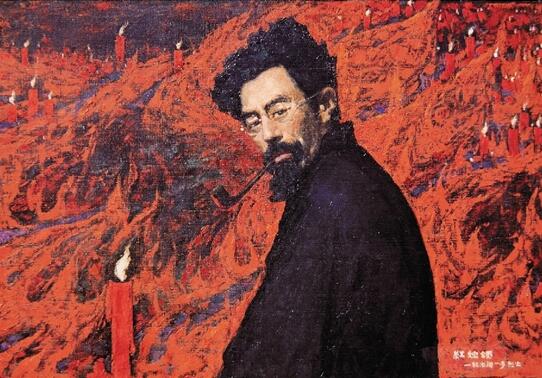 “画中闻一多的形象源于我父亲生前最喜欢的一张照片。当年在昆明的时候和学生一起去旅行,学生给他拍的,一直挂在家里墙上,也是我印象最深的一张。”于是,闻立鹏就将这个经典的闻一多形象和红烛燃烧的意象融入到了画面中。作品名字叫做《红烛颂》,则是因为闻一多先生有一首诗叫做《红烛》,闻立鹏说画这张画的时候反复在读这首诗。“红烛啊!这样红的烛!诗人啊,吐出你的心来比比,可是一般颜色?……”时隔多年,在和记者的交流的时候,闻立鹏又动情地背起了这首诗。“我觉得这首诗最能代表我父亲的革命心境和人格,诗的内容也特别好。所以,我尽量把他的文学意境转变成绘画意境。我把红烛和大火两个意象融合在一块,加上这个经典的形象,形成了这张作品。”