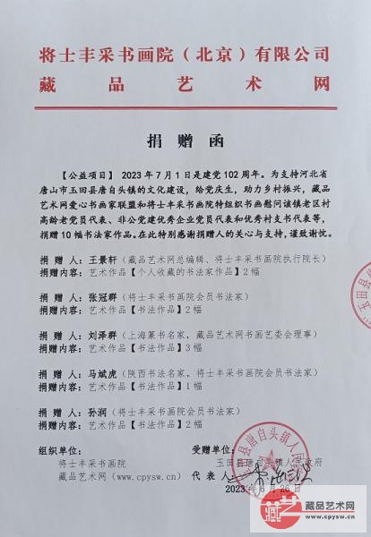 其中,藏品艺术网总编辑、将士丰采书画院执行院长王景轩捐赠2幅其收藏的书法作品;将士丰采书画院会员书法家张冠群捐赠2幅书法作品;上海篆书名家、藏品艺术网书画艺委会理事刘泽群捐赠3幅书法作品;陕西省书协会员、藏品艺术网书画艺委会和将士丰采书画院会员书法家马斌虎捐赠1幅书法作品;将士丰采书画院会员书法家孙润捐赠2幅书法作品。