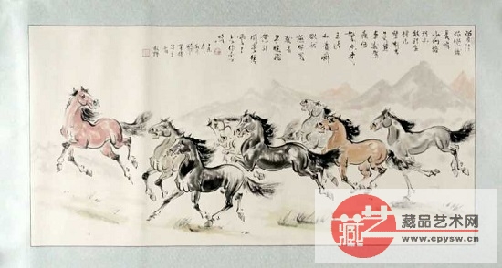 袁春宝:水墨八骏轩主人,笔名醉菩提。1969年生于新乡市。潜心研究中国二十余年,以画马见长,主攻八骏图,兼顾山水花鸟。多年来时刻牢记徐悲鸿先生“画马当以真马为师”的话语,自2002年以来多次赴内蒙古大草原、亚洲第二大赛马场、市槐园马术俱乐部等地写生,了解马的动态和结构,结合以往中国历代画马名家作品的研究剖析,夜以继日的练习,逐步形成了自己独特的画马风格:造型简约、用笔犀利、神骏异常。达到了“精气神”的高度统一,受到书画同行的一致好评和大众喜爱。