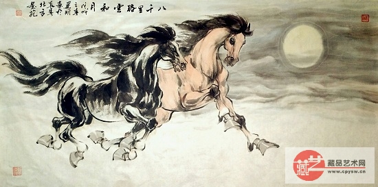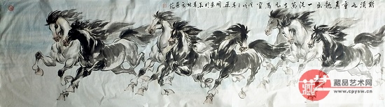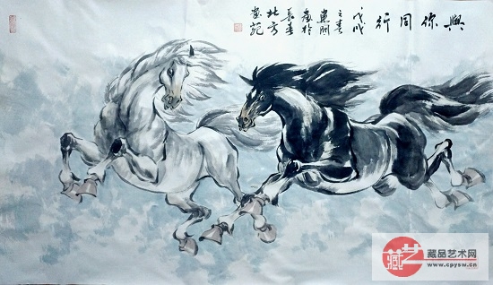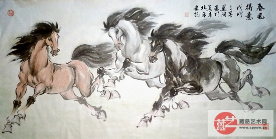 刘建国擅长画马,他笔下的马,从笔法上可以看出古为今用,破古以线条勾勒马的形体动态,而以书法的字体结构来构马的形体结构,并大胆创新用中锋、侧锋、逆锋、皴染点擦来表现。总之由色墨构成的丰富多彩的用笔手法,神奇地表现了马的勇往直前的精神面貌,又大大拓宽了前人画马的格局和表现力,他驾驭自如的笔墨技艺,不露痕迹地把多种造型艺术手法融入到他的马的作品中,他笔下的马结构严谨,个性鲜明,马的矫健给人以灵动、流畅、潇洒、英俊,激情澎湃,其写意精神充满了唐风古韵之气。形成了属于自己画马的语言和审美特质,创造了独具一格的唐韵骏马。