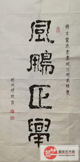 非遗水书传承人张兆铼书“风鹏正举” 7月27日,将士丰采书画院将满3周岁,非遗水书传承人、书法家张兆铼挥毫创作,一幅“风鹏正举”作品赠送书画院收藏表祝贺。 张兆铼,男,1952年生人,幼年喜爱书法从师山东省画院高级画师、书法家张耀峰门下,得到身教真传。现为莱芜职业技术学院特聘专家,英国牛津艺术学院客座教授,济南市工商联会员,中国硬笔书法协会会员,济南市硬笔书法家协会理事,中国民族书画家协会会员,世界华人书画家协会(香港)会员,藏品艺术网书画艺委会会员、签约书法家。