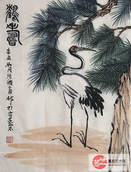 2021年3月12日(正月二十九)张国富原创写意作品《鹤寿》贵宾酒商标54.5X44.5