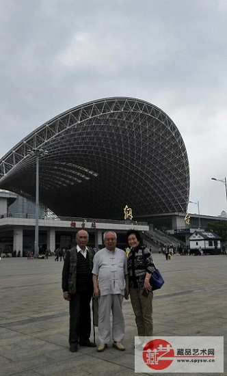 2016年5月3日,张国富(左)在烟台站接以故恩师周抚民先生(中)荐临烟台合影