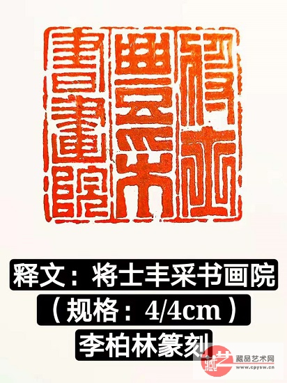 藏品艺术网北京8月23日讯 日前,著名篆刻家李柏林先生应中国民主同盟盟员,藏品艺术网总编辑,将士丰采书画院执行院长王景轩所嘱,为将士丰采书画院治印,其选用汉缪篆入印,彰显大气肃穆。