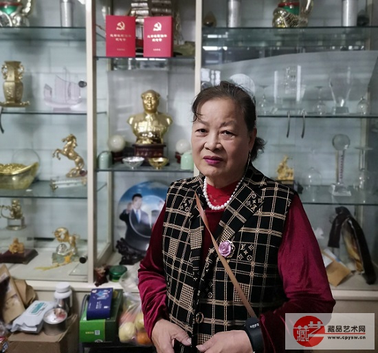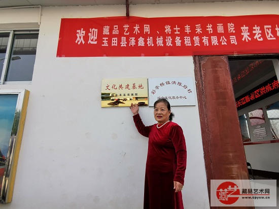 邵积平将军夫人王慧智在藏品艺术网、将士丰采书画院“文化共建基地”牌匾前留影