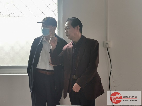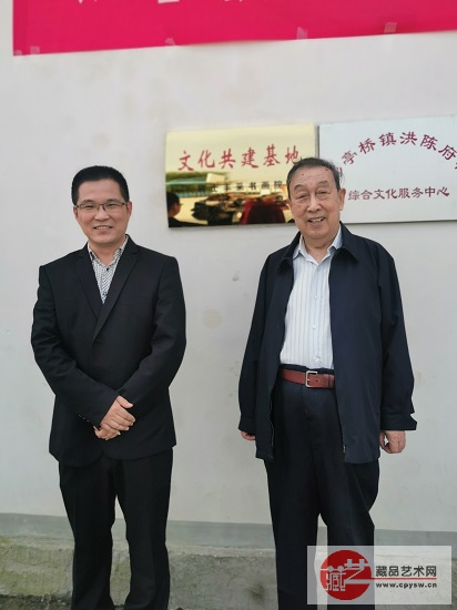 姚振普将军(右)与藏品艺术网总编辑、将士丰采书画院负责人王景轩(左)在“文化共建基地”牌匾前合影