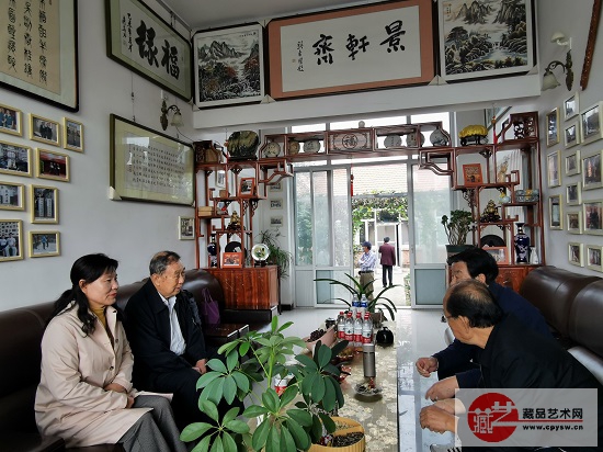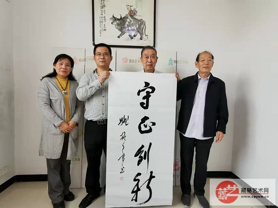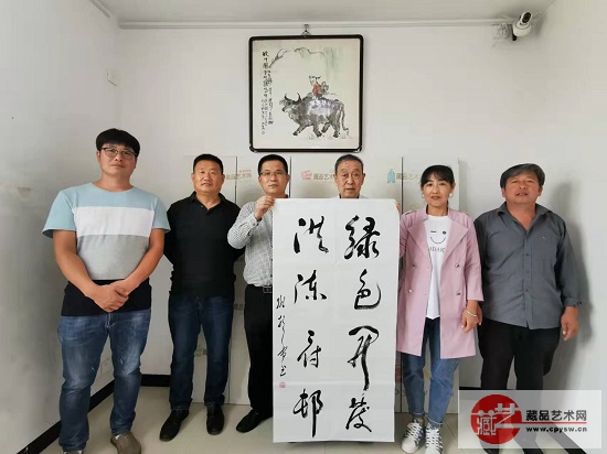 姚振普将军(左2)在洪陈府村王景轩的小院为藏品艺术网和将士丰采书画院负责人王景轩题写“守正创新”作品