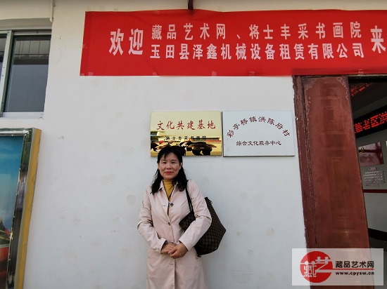 赵艳彬在藏品艺术网、将士丰采书画院“文化共建基地”牌匾前留影