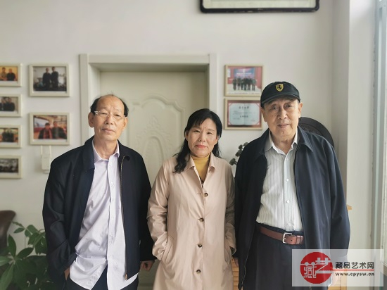 赵艳彬(中)与姚振普将军(右)、将士丰采书画院副院长、书法家韩山林(左)在洪陈府村王景轩的小院