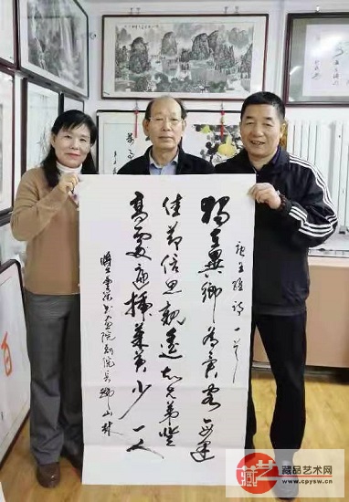 赵艳彬(左)与丈夫“大国工匠”卢成林(右)同将士丰采书画院副院长、著名书法家韩山林(中)在一起