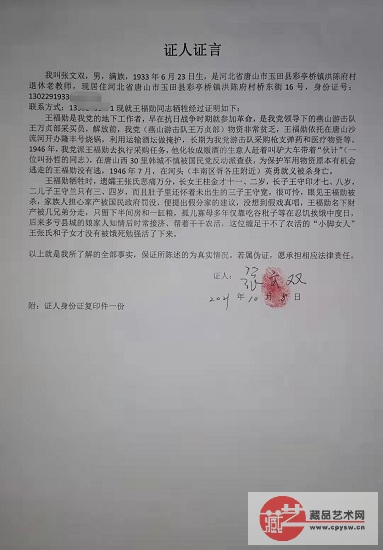 文革中,家族被认定成中农成分,奶奶的几个子女虽陆续长大成人,但日子并不好过。1970年,复员回乡的二伯王守兰眼见家中日子艰难,无奈之下找到爷爷所在游击队队长王万珍,王万珍热情地接待并手写了一封证明信,信里写明了爷爷王福勋牺牲的经过、时间和地点。