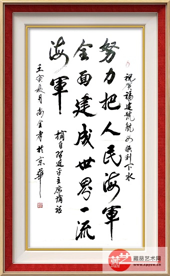 尚全孝将军书“护神州海疆,展华夏雄风” 尚全孝将军书习主席讲话“努力把人民海军全面建设成世界一流海军” 作者简介: 尚全孝,辽宁省军区原副司令员,少将军衔。 1943年生,河北邯郸人。1962年入伍,历任沈阳军区科长、部长、集团军副军长、辽宁省军区副司令员等职。 撰写并发表《试论将军文化蕴涵的文化软实力》等文章、诗词数十篇。喜爱书法,为纪念毛泽东、周恩来、朱德等老一辈无产阶级革命家等大型公益活动创作作品数百幅,并被收入《英雄赞歌》、《更喜岷山千里雪》等数十部书籍,有许多作品被省级以上博物馆、纪念馆及中外友人收藏或刻入碑林。