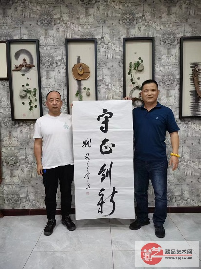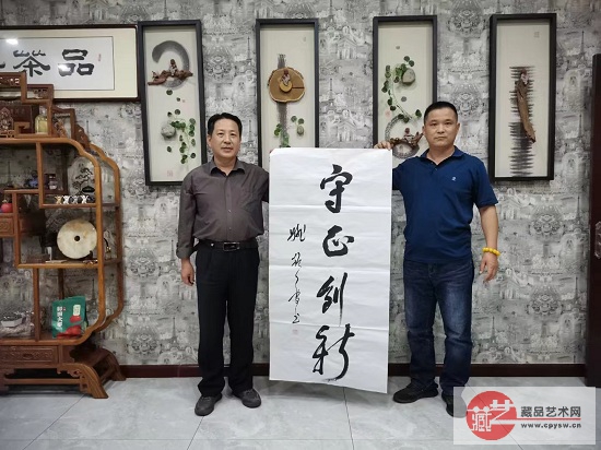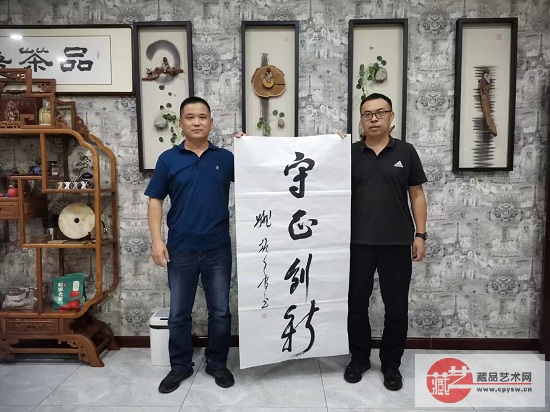 藏品艺术网总编辑、将士丰采书画院负责人王景轩(右)与玉田庆波地产负责人张立军(左)在姚振普将军题写的“守正创新”作品前合影