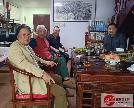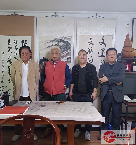 北京湖社画会副会长、著名画家陈忠(左1),秘书长、著名画家关志英(右2)和著名人物画家赫连兴中(左2)与藏品艺术网总编辑、将士丰采书画院执行院长王景轩(右1)一起座谈交流