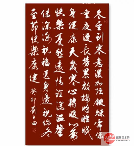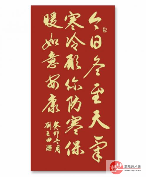 刘巨田少将 艺术简介 刘巨田将军,1954年生于河北省井陉县,原武警北京总队副司令员,少将军衔。自幼喜爱书法,退休后参加了中书协、海之春等书画院的培训,受到刘宏卫、刘俊京、周光喜、赵望来、李炯峰等多位名师的指导。他主研行书兼篆、草书,形成了自己独特的风格,多次参加军内外举办的书画展,受到广泛好评。 刘巨田少将军旅照 冬至节气作品欣赏 冬至 今日冬至,天气寒冷,愿你防寒保暖如意安康 冬至快乐 《问候祝福语》 藏品艺术网《名人新作》专栏 主办:藏品艺术网 协办:将士丰采书画院 特约名誉主编:姚振普(少将)、崔根峰(少将)、邵积平(少将)、尚全孝(少将)、刘巨田(少将)、黄再寿(少将)、李德金、周春华、金思宇、徐旷达、任麟、赫连兴中、汪运昌、刘智辉、赵俊生(大校)、李清虎(大校)、孙敦秀、张成银、陈从本、郑克石、刘庆路、张国富、刘泽群 本期人物推荐: 将士丰采书画院将军书画委员会 本期专栏供稿:刘巨田(少将) 本期专栏主编:王小艳 审核:韩山林 审定:王景轩 投稿邮箱:news@cpysw.cn