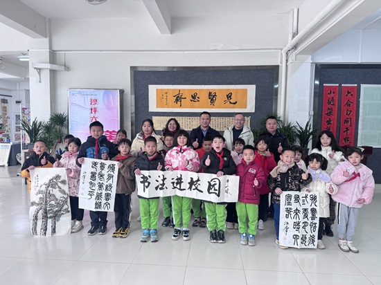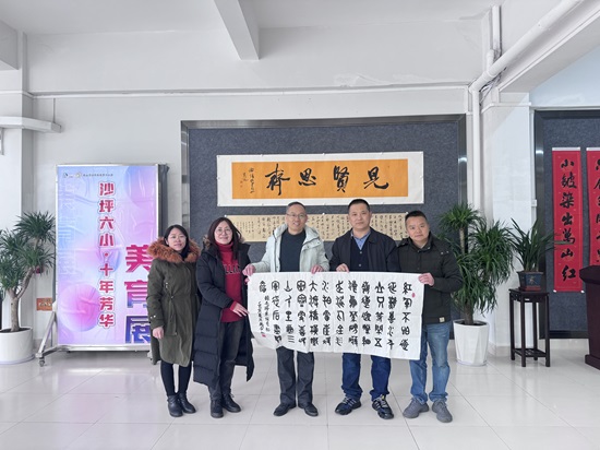 书画溢满了浓浓的墨香,彰显了书法艺术的魅力。12月22日,北京民盟盟员、将士丰采书画院负责人、藏品艺术网总编辑王景轩来到广东省江门市鹤山市沙坪街道第六小学走访慰问,将藏品艺术网爱心书画家联盟和将士丰采书画院艺术家精心创作的五幅红色和励志主题书画作品,赠送到学校领导手中,受到师生们的欢迎。鹤山市教育局党组成员、副局长林千里,鹤山市沙坪街道第六小学党支部书记校长冯建玲、副校长麦万记等出席作品捐赠仪式。