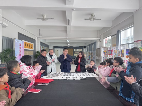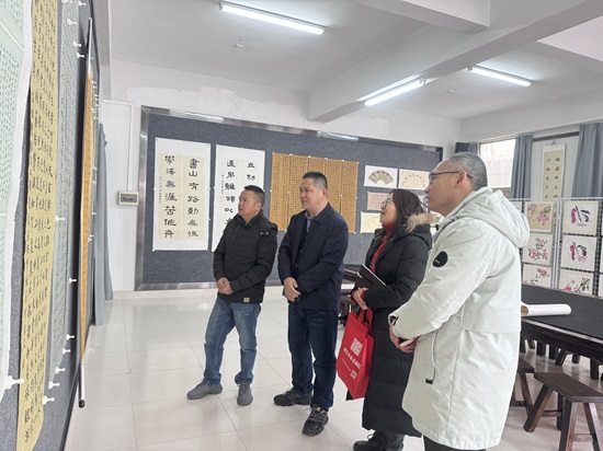 北京民盟盟员、将士丰采书画院负责人、藏品艺术网总编辑王景轩(左2)在鹤山市教育局副局长林千里(右1),鹤山市沙坪街道第六小学党支部书记校长冯建玲(右2)、副校长麦万记(左1)陪同下观看师生书画作品