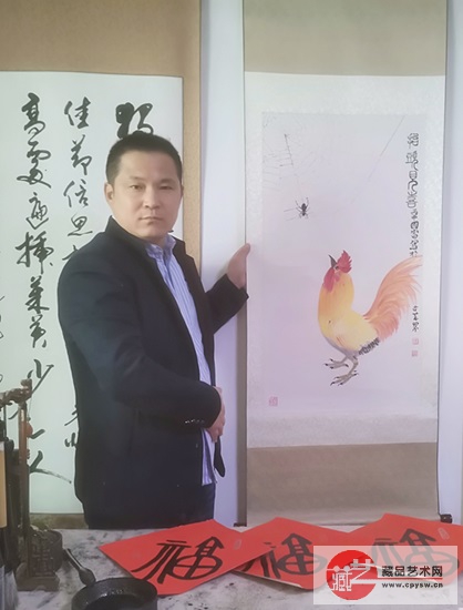 将士丰采书画院负责人王景轩在张国富赠送的国画《抬头见喜》作品前留影