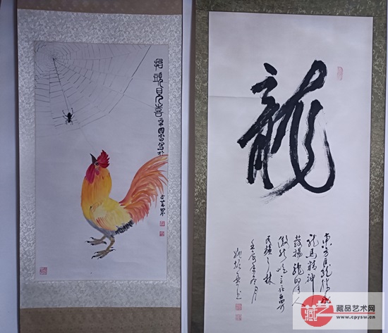 张国富国画《抬头见喜》作品与姚振普将军书法《龙》作品一起悬挂在将士丰采书画院北京经开区工作室展示