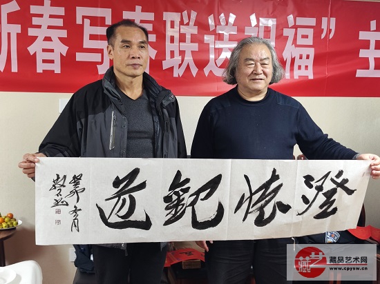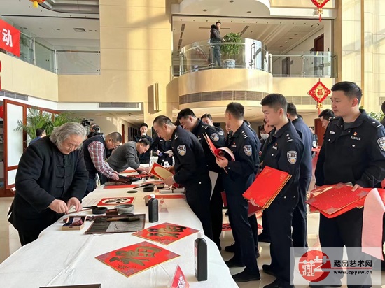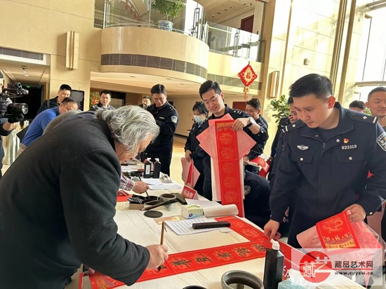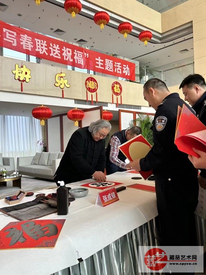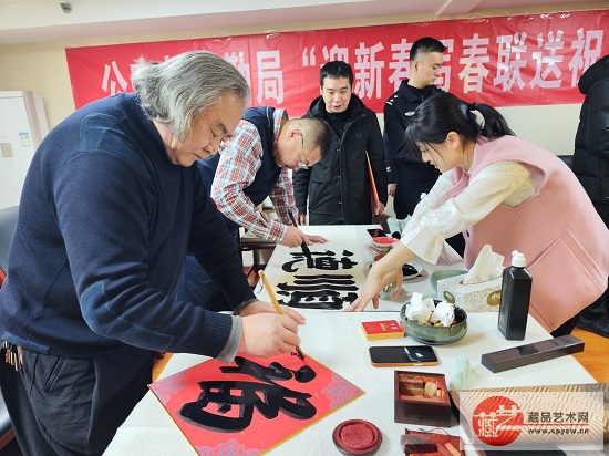 活动现场,张成银、辛志东和薛居波三位书画名家为公安部某局干警写春送福