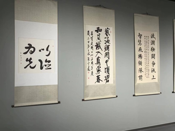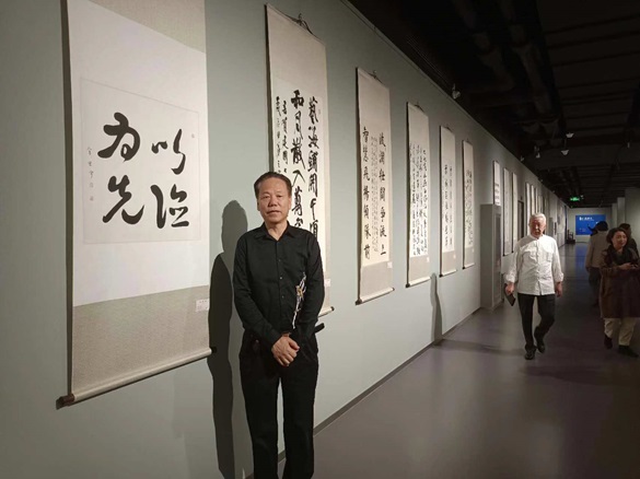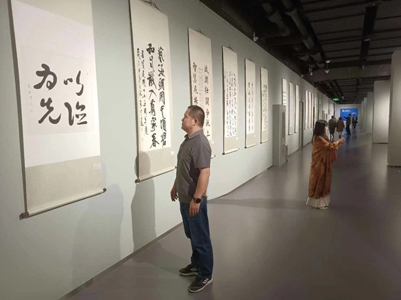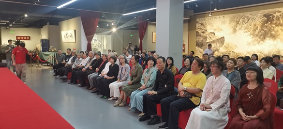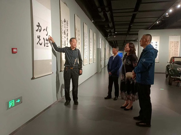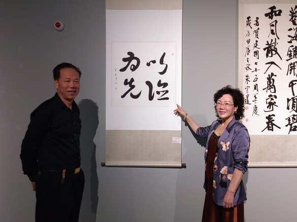 金思宇致辞 金思宇前排(右四)就坐 金思宇与部分嘉宾合影,左三为北京国画艺术家协会主席王晓卉 2024年9月28日上午10时,由北京国画艺术家协会、北京国风书画普及教育学会主办,人民时代有限公司艺术中心承办的“祖国颂——庆中华人民共和国75华诞书画作品展”在北京和·艺术馆开幕,中国书法家协会会员、将士丰采书画院顾问、名人书法家金思宇先生参展的一幅书法作品,受到各界嘉宾关注。 左一为金思宇参展书法“以德为先” 金思宇向嘉宾们介绍参展作品情况 中国证监会证券基金机构监管部副主任祁春波(右)与金思宇(左)在参展书法作品前合影 藏品艺术网总编辑王景轩驻足观看金思宇书法 金思宇与其参展书法作品合影,著名书法家孟繁禧先生(左二)在参观展出的书画作品