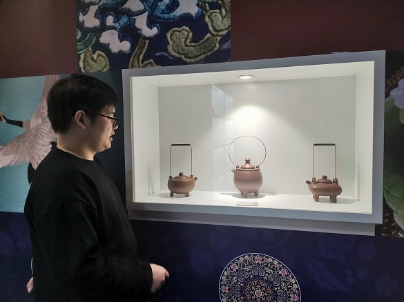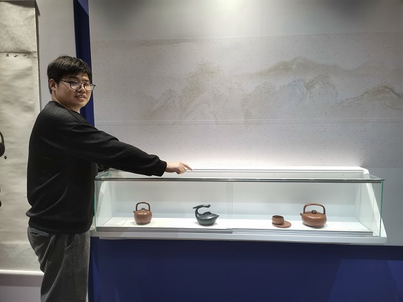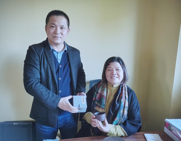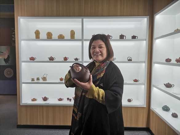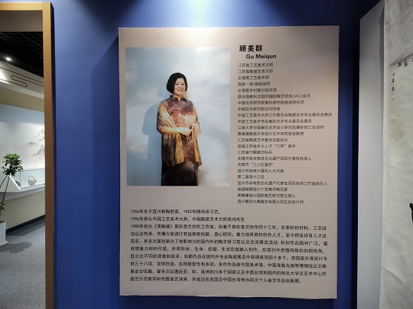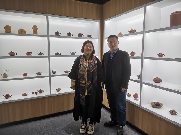 王景轩(右)与顾美群女士(左) 顾美群女士(右)向王景轩院长(左)赠送一件亲手制作的紫砂主人杯礼品 2024年10月22日下午,藏品艺术网总编辑、将士丰采书画院院长、原央媒时政军事记者王景轩到访北京高碑店非遗民俗展览馆拜会紫砂制壶大师顾美群女士,受到顾美群女士和其子、韩国留学博士魏臻先生的热情接待。 顾美群女士和她的紫砂壶新作 顾美群,系江苏省陶瓷艺术名人、研究员级高级工艺美术师、中国紫砂优秀中青年陶艺家、首届陶都宜兴十佳青年陶艺家、中国工艺美术学会会员、江苏省陶艺专业委员会理事、江苏省陶瓷行业协会会员、江苏省民间文艺家协会会员、巾帼女陶艺家联谊会理事、宜兴市第十三、十四、十五、十六届人大代表。现任宜兴市美陶缘陶艺有限公司艺术总监。 顾美群艺术介绍展板 魏臻博士介绍馆藏顾美群紫砂壶新作 魏臻博士介绍馆藏顾美群紫砂壶作品
