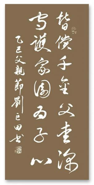 将军自幼习书,师从刘洪彪、李炯峰等名家,融行书之畅达与篆草之苍劲,形成独树一帜的军旅书风。本期作品既延续其“剑胆墨魂”的艺术语言,又以传统吉语,致敬天下父亲的无言奉献。让我们通过这些力透纸背的墨迹,感受军人父亲的家国情怀与寸心柔情。