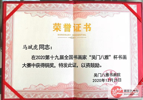将士丰采书画院会员、书法家马斌虎 马斌虎,1981年10月入伍,47军141师炮兵团从戎6年。酷爱书法坚持30多年,现为藏品艺术网书画艺委会会员,将士丰采书画院会员,陕西省书法家协会会员,陕西毛体书法协会、于体书法协会会员,渭南市书法协会会员,蒲城县书法协会会员,冨平县友谊书画院院长等。作品多次参加全国性书画大赛获奖及证书,省市县书画活动每年参加。作品已被多位军地首长及各界人士所收藏。 展播作品 马斌虎书法作品“舍得” 马斌虎书法作品“平安是福” 马斌虎书法作品“精气神” 马斌虎书法作品“九万里风鹏正举” 马斌虎书法作品“厚德载物” 记录瞬间·荣誉载道·回眸2020 2020年,马斌虎作品在第十九届全国书画家“吴门八雅”杯书画大赛中荣获铜奖
