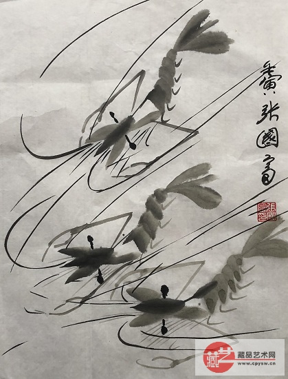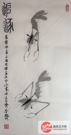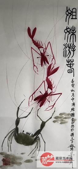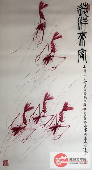 2022年3月25日张国富原创写意作品《姐妹游春图·图中红虾寓意天波杨府八姐九妹游春,遇宋仁宗游春……》 原版生宣 规格:68X34 CM