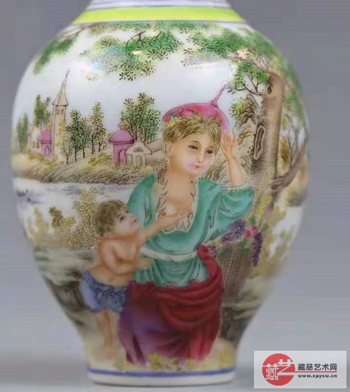 描述:本品小而巧、精美。瓷胎细薄、釉面光滑、鲜艳柔和,小小器形勾勒出一幅生动活泼、精美绝伦西洋人物生活照。釉面用放大镜浮现出纹片并拌有天然哈蜊光,底纯白釉,蓝料款“乾隆年制”?(如图三)。绘画西洋人物宫廷珐琅彩瓷,在市面上极为罕有难得。翻阅资料,在香港佳士得和苏富比拍卖场基本只曾两例,再有大英博物馆一例。故目前珐琅彩西洋人物寥寥无几。本品一偶然机会拥有,实属难得,收藏价值巨大。