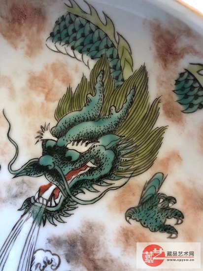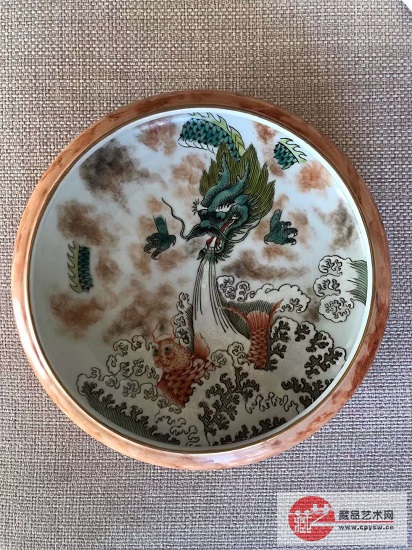 洗,又称洗子、水盂,因形似堂锣,又名堂锣洗。为文房用具。器底为卧足平底。器外饰一层仿木釉,器内以粉彩绘一出云龙,龙嘴吐出大水直洒江海中的鲤鱼(龙子)。画面恢宏大气,气势磅礴。寓意“教子成龙”、“望子成龙”。画工精细,布局严谨。特别是云气以写实手法描绘,龙身和龙爪在云层里闪现,使整个画面显得十分灵动活泼。海水浪花用白粉描画,凸出于釉面,有明显开片纹。时代感、老旧感极强。洗口描金彩,已有部分脱落。器底圈足为卧足,修足规整精细。露胎处瓷质坚密。底部正中有“大清乾隆年制”六字手写青花款。字体工整有力,为乾隆朝标准年款。