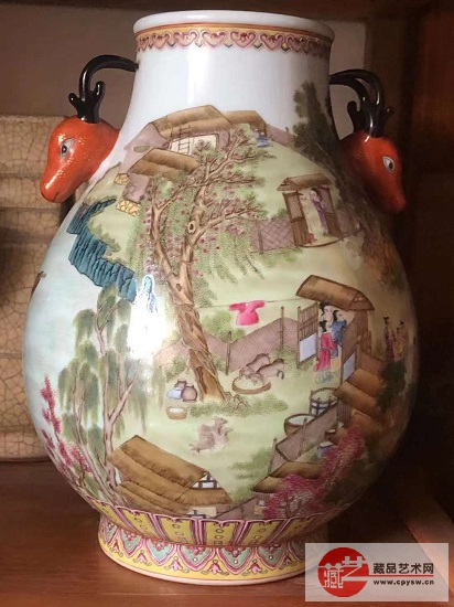 藏品名称:粉彩描金全景“村乐图”鹿头尊。