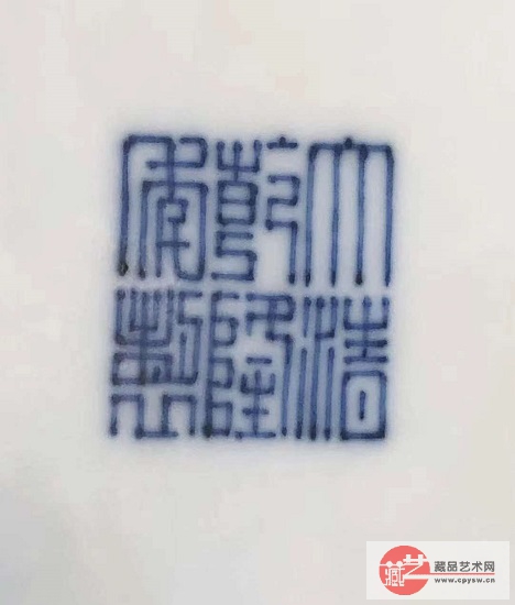 鹿头尊的底部有“大清乾隆年制”青花六字篆书款。这是全器唯一的青花部分。这是用清三代常用的珠明料书写。将款识图片放大既可看出字体的停顿处和交笔处都有明显和积墨。每一笔划的两边颜色重些,笔道中间色淡。这是使用珠明料才会有的明显特征!这是笔者研究了大量出土的乾隆青花瓷片后得到的结论。这一青花款也进一步证明了这鹿头尊是乾隆本年的器物。