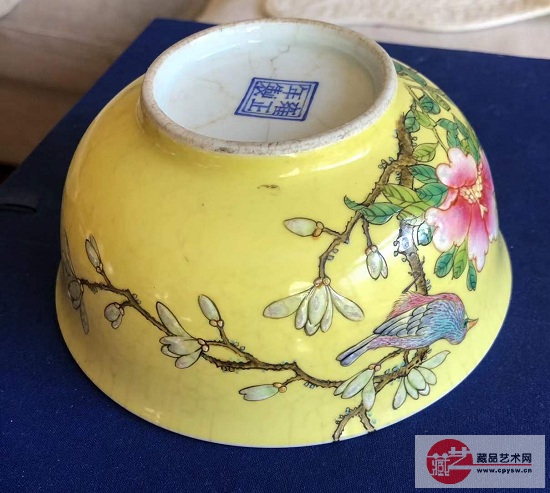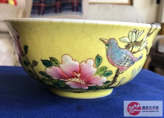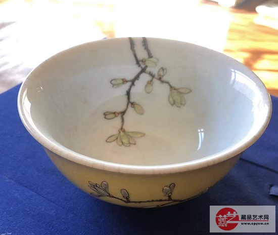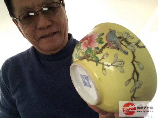 张惟林摆弄明黄釉法朗彩宫碗藏品