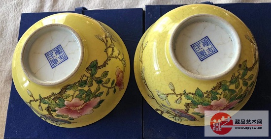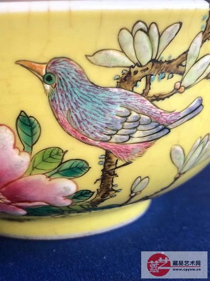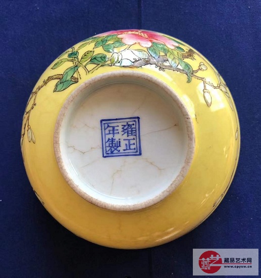 一对雍正明黄釉法朗彩宫碗。清雍正时期规秩森严,明黄釉瓷器专属皇家用器,民间不得使用!黄釉法朗彩更是重中之重。这对宫碗于明黄釉地上用法朗彩绘制海棠花和玉兰花,一只翠鸟立于玉兰枝头。玉兰花枝过墙进入碗内。(这是典型的雍正画法)。整个画面寓意“玉堂春色”或“玉堂富贵”。画风清雅高贵。令人赏心悦目。翠鸟翎毛细腻、色彩斑斓。在黄釉衬托下辅以白色盛开的玉兰花和粉红色的海棠花更显富丽堂皇。碗底正中有一兰料雍正年制四字楷书方戳款。