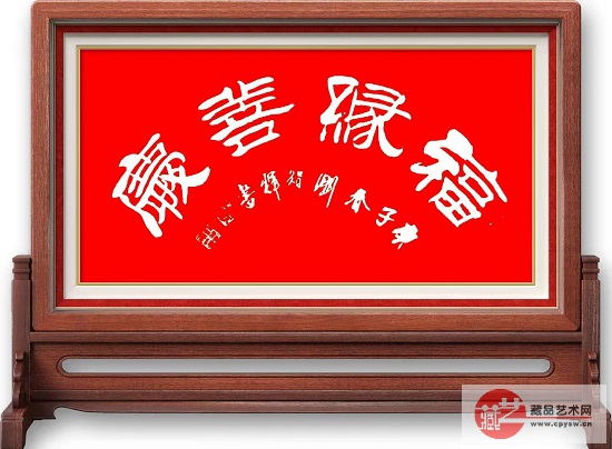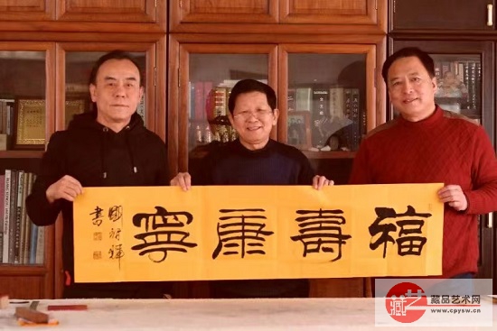 刘智辉(中)与友人在书法“福寿康宁”作品前合影