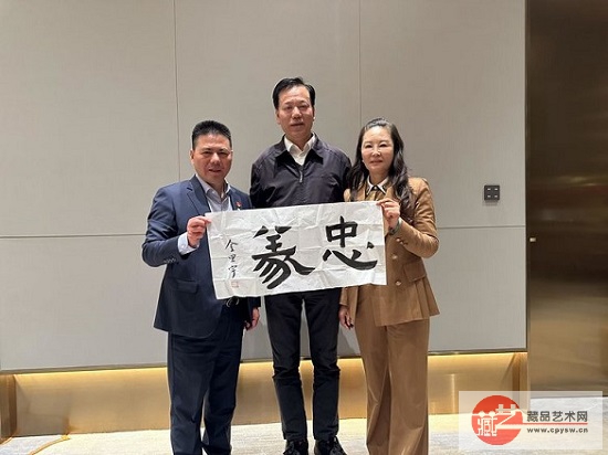 金思宇(中)向远东控股集团董事局主席蒋锡培(左)夫妇赠送书法“忠义”作品