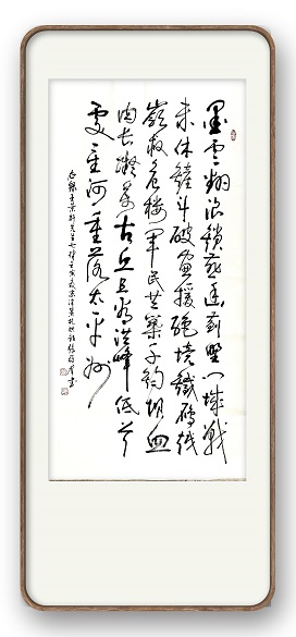 2025年盛夏的京津冀抗洪事件,在王景轩先生笔下化作“墨云翻浪锁燕幽”的壮阔图景,而书法家张冠群则通过遒劲笔触将这首《七律·壬寅夏京津冀抗洪歌》凝固为艺术丰碑。诗与书在此形成奇妙的互文:前者以“铲斗破窗”“铁鹰越岭”的意象群构建抢险现场的视觉蒙太奇,后者以“千钧坝”“万古丘”的墨色浓淡呼应军民团结的精神海拔。