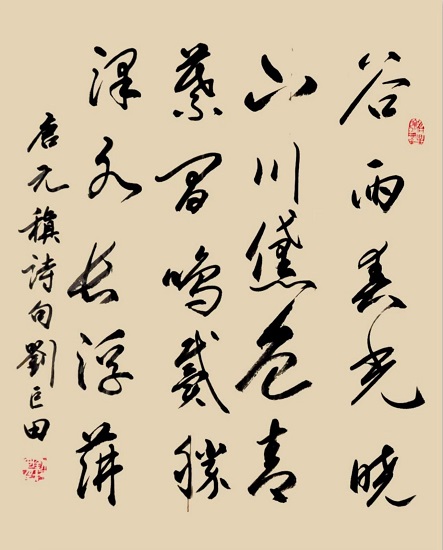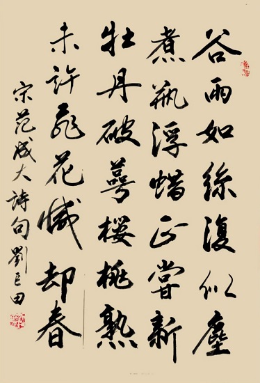 刘巨田,1954年10月出生,河北井陉县人,武警北京总队原副司令员,少将军衔。中国书画家协会名誉副主席,中国国际书画艺术研究会名誉顾问,将士丰采书画院、海之春书画院顾问,北京市楹联学会会员。自幼喜爱书法,退休后参加了中书协、海之春、千尺书画院的培训,受到刘洪彪、刘宏卫、刘俊京、周光喜、赵望来、李泊达等多位名师指导。以行书为主兼习篆、隶、草书行成了自己的风格,多次参加军内外举办的书展,受到广泛好评,作品被多家机关单位、企业机构收藏。